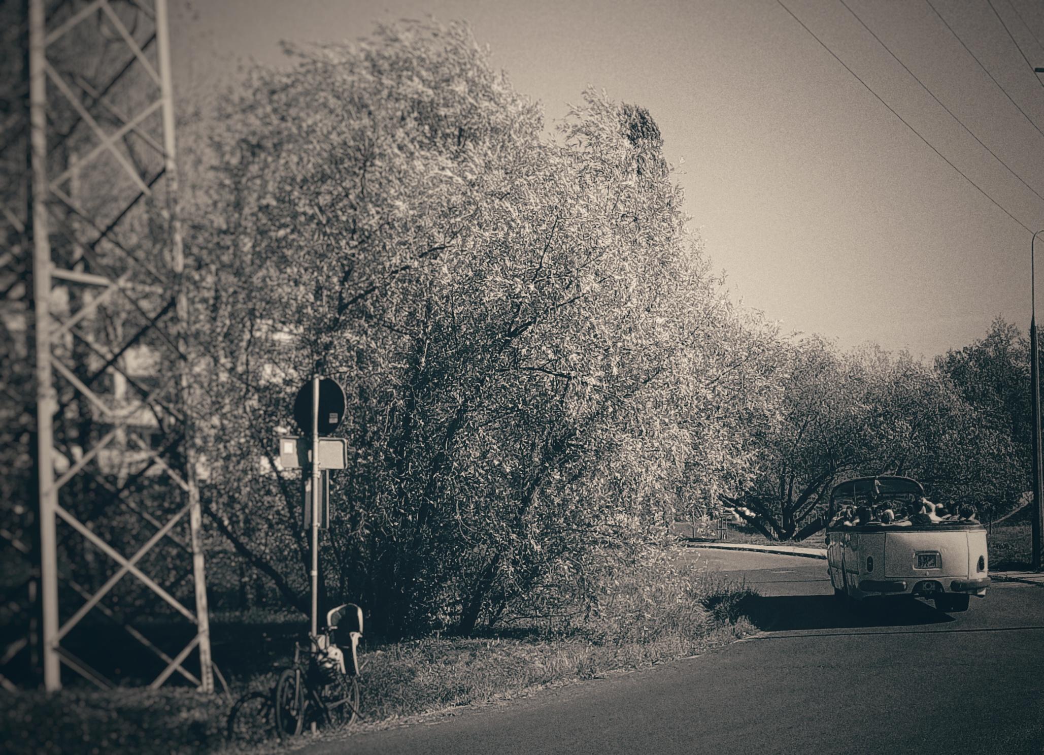 Zdjęcie stylizowane na starą fotografię w sepii. Po zakręcającej w lewo drodze jedzie zabytkowy autobus Jelcz MEX w wersji cabrio. Z lewej strony słup wysokiego napięcia, drzewa i bloki osiedla Kabaty w Warszawie. Ujęcie od tyłu autobusu.