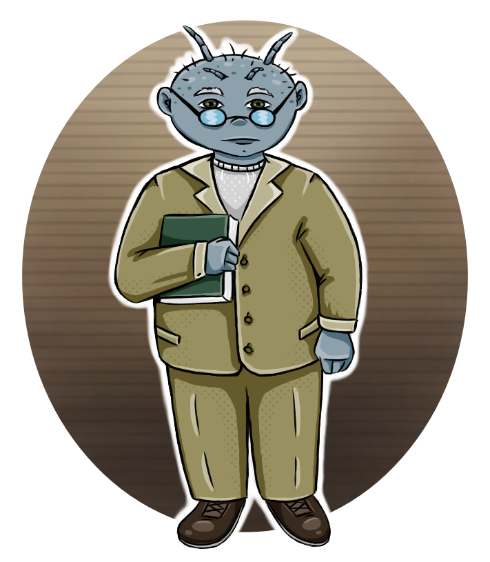 Cartoon style drawing of a gray humanoid creature with big round head. He is short and bald, with two pairs of insect antennae on his head. He is wearing grandpa-style beige suit and small round glasses.