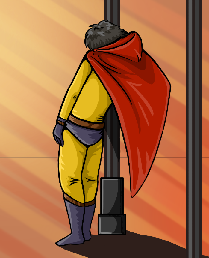 Cartoon style drawing with thick lines, of person in yellow suit, leaning on street lantern pole. He has red superhero cape and dark hair. He is turned back so face is not visible. All background is compound of orange stipes in various shades, giving sunset vibe.