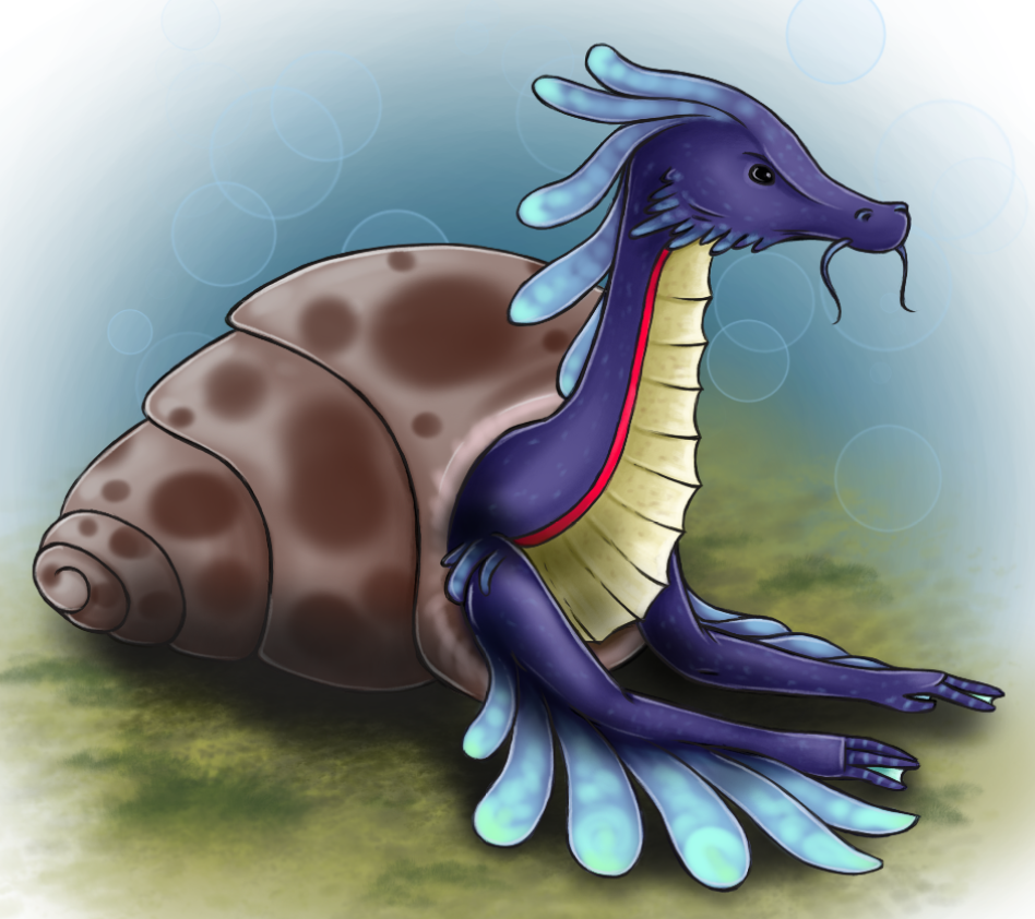 Long time ago I saw random post here, about wishing to see sea #dragons... As I understood, it would be something similar to hermit crabs, occupying found shells. So I tried to create a #dragon wearing empty #shell, stylized slightly like seahorse or sea snail - because deep sea creatures look like this blobcatGiggleSmirk