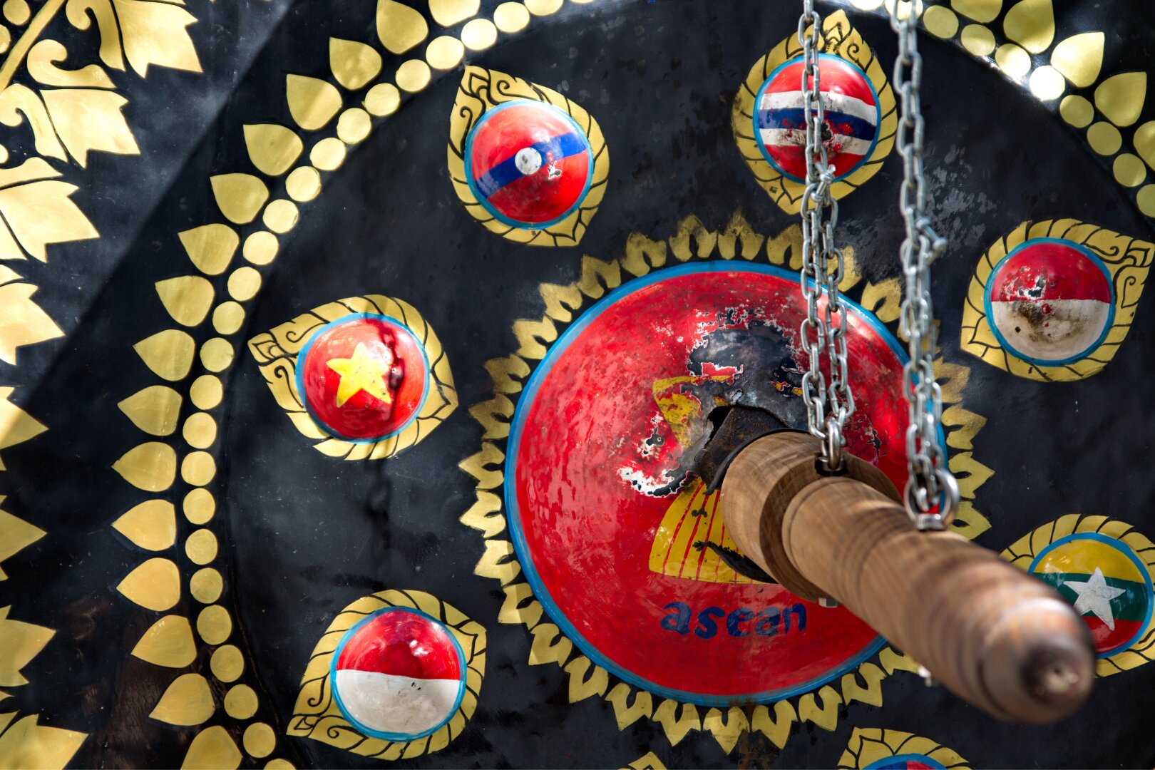 A traditional gong painted with the flags of ASEAN countries — unity in diversity, strength in harmony. Each nation has its own tone, yet together they create one melody.
