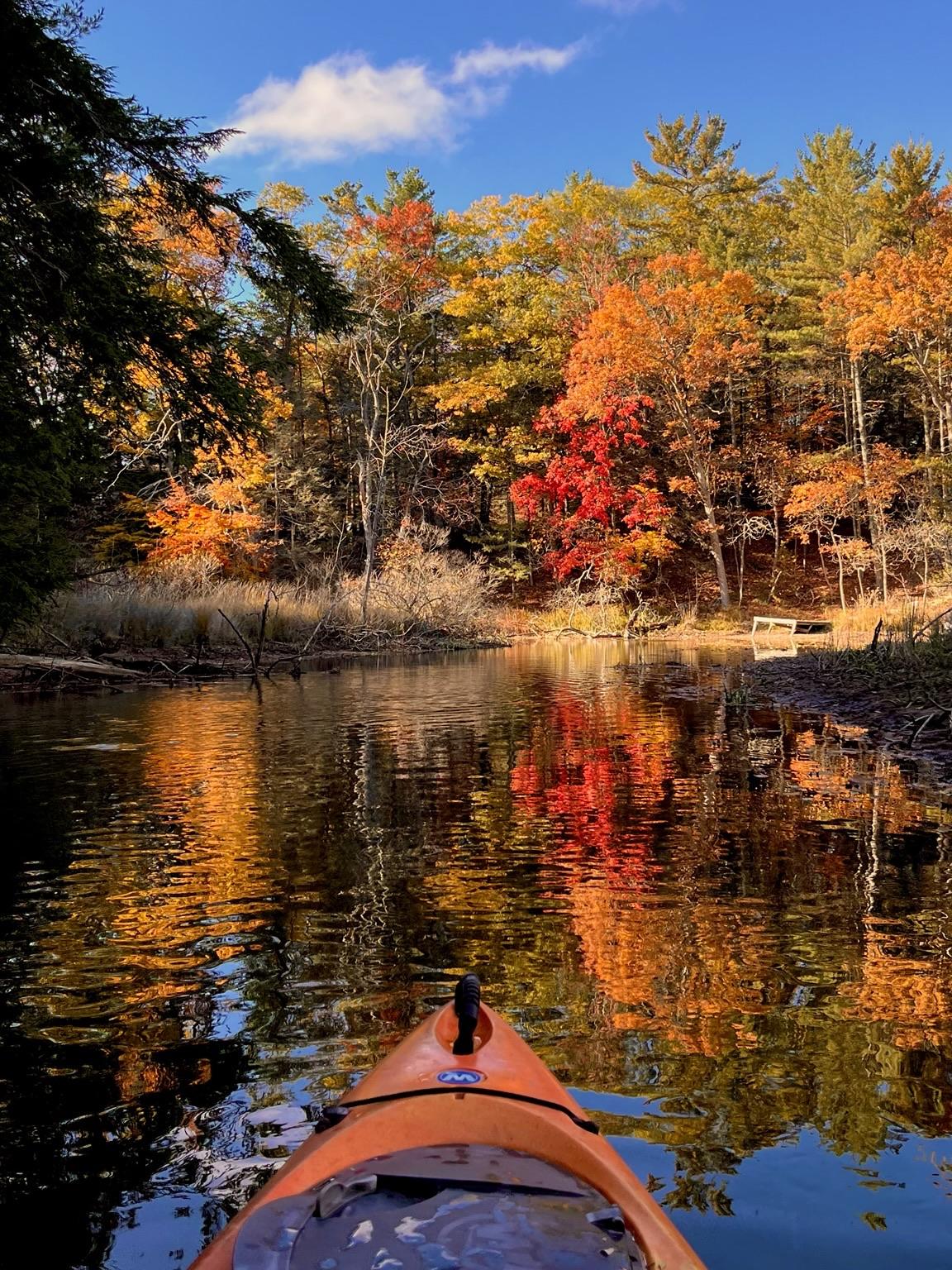 A kayak is traveling down a winding creek between sand dunes overgrown with trees in autumn colors reflecting on the calm water. Bright orange, red, and yellow leaves contrast against a clear blue sky, creating a serene natural scene. In the distance, an old wooden  dock is tilted from the yearly freezing and thawing. In the distance the creek turns to the left, leading into the unknown.