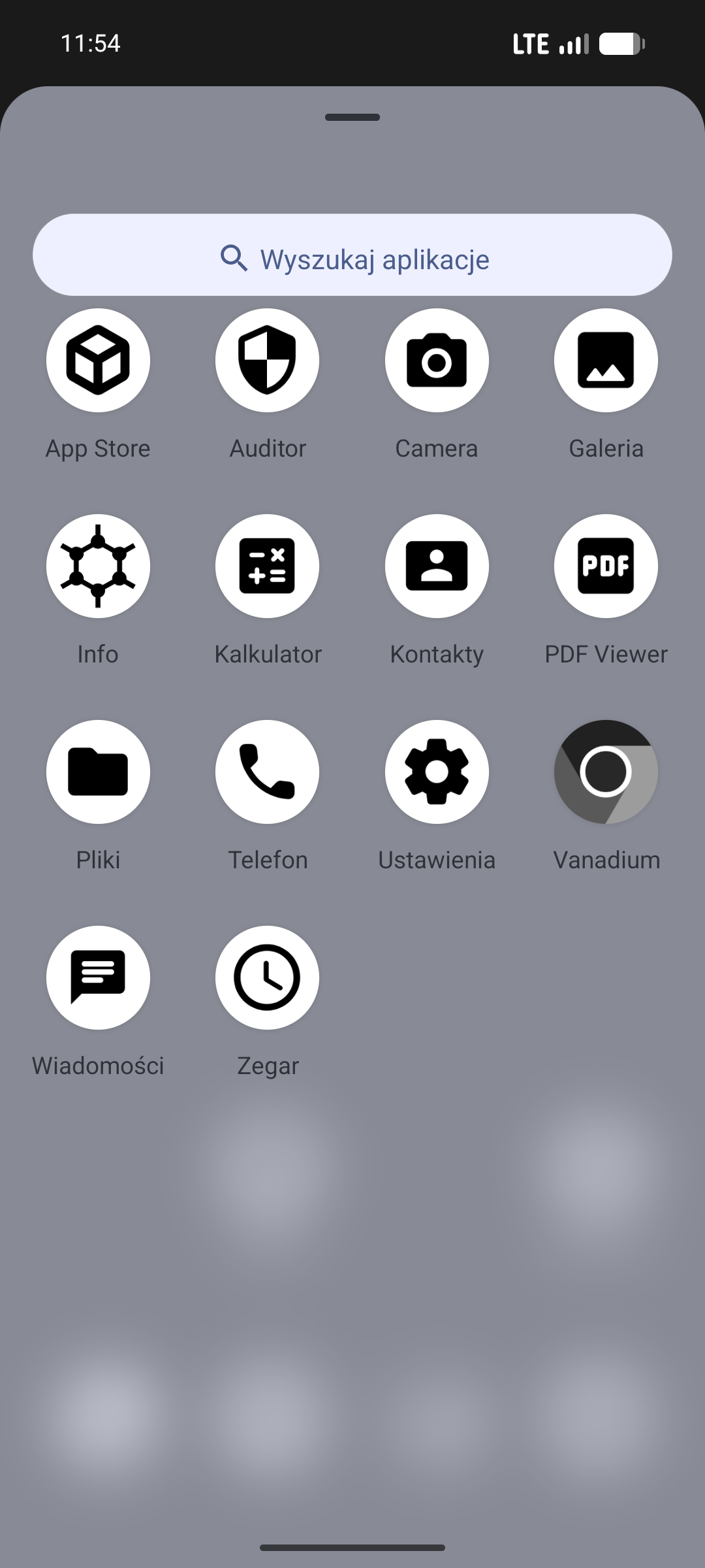 Już odwiedzając oficjalną stronę możemy dostrzec jej ascetyczny charakter – znajdziemy na niej praktycznie tylko tekst. I to dużo tekstu. Żadnych zrzutów ekranu, czy grafik zachęcających do pobrania i wypróbowania. Nie inaczej jest z samym GrapheneOS. Po uruchomieniu wita nas cały czarny ekran z kilkoma biało-czarnymi ikonami. Podobnie jest po otwarciu szuflady z aplikacjami. Znajdziemy tutaj tylko minimum aplikacji niezbędnych do działania telefonu takich jak Dialer, Kontakty, Wiadomości, Kamera, Przeglądarka i App Store. Jednak w tym właśnie cała siła omawianego systemu – żadnych rozpraszaczy i zbędnego oprogramowania.