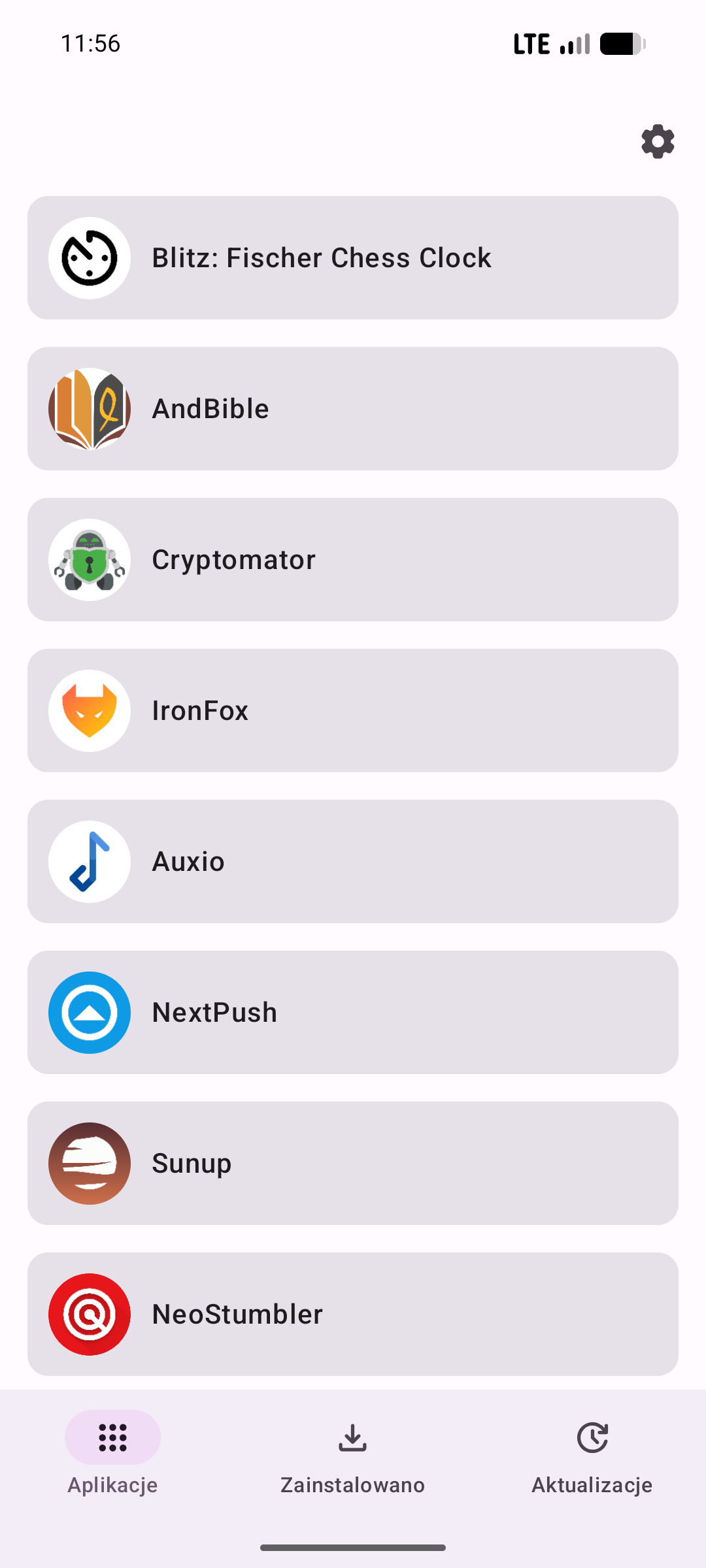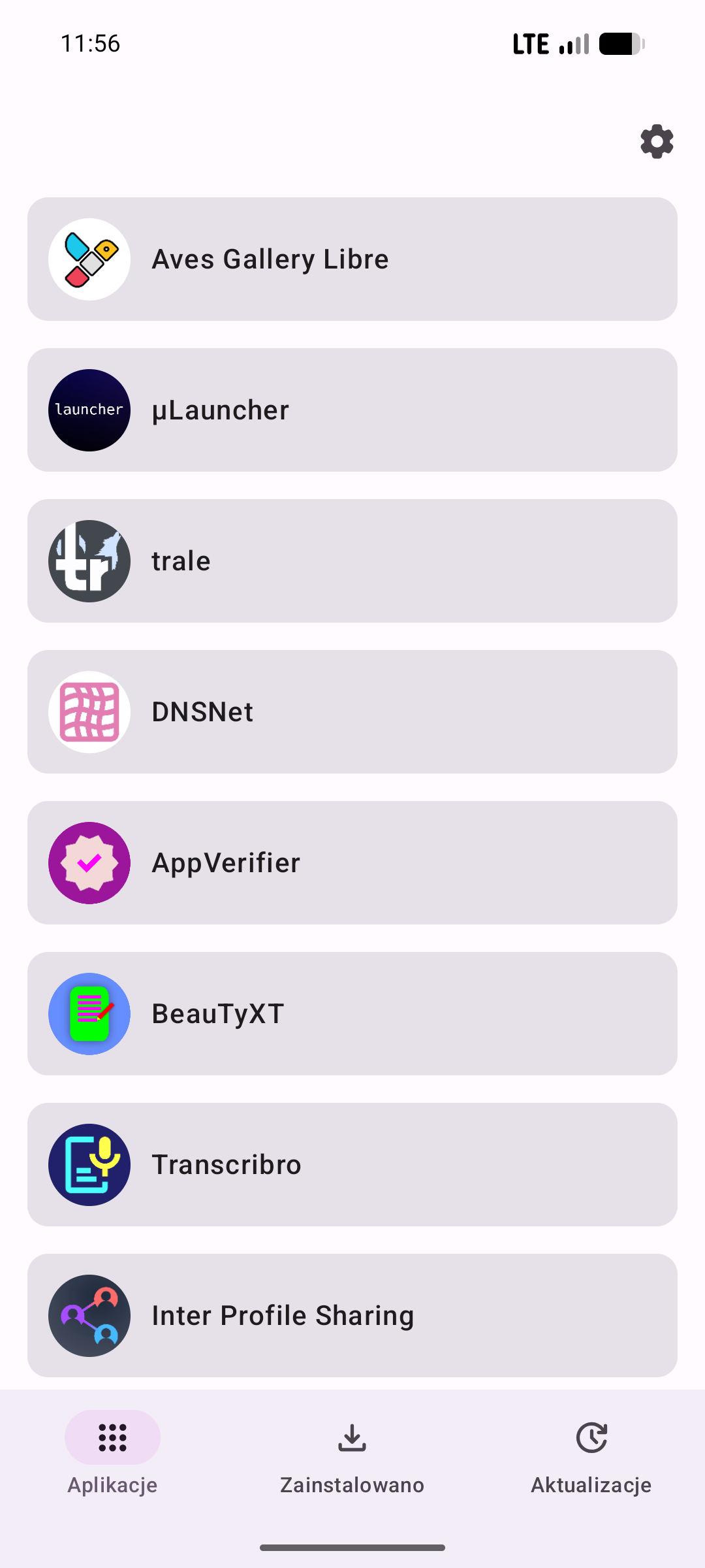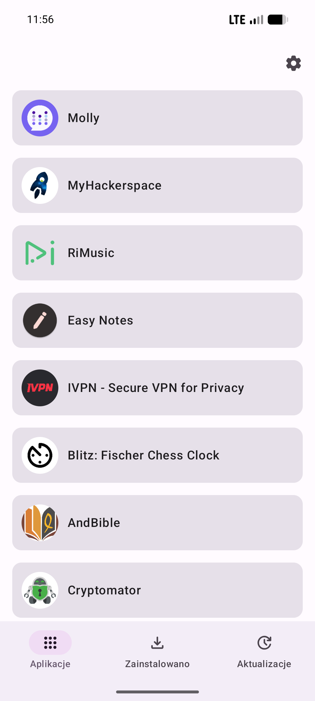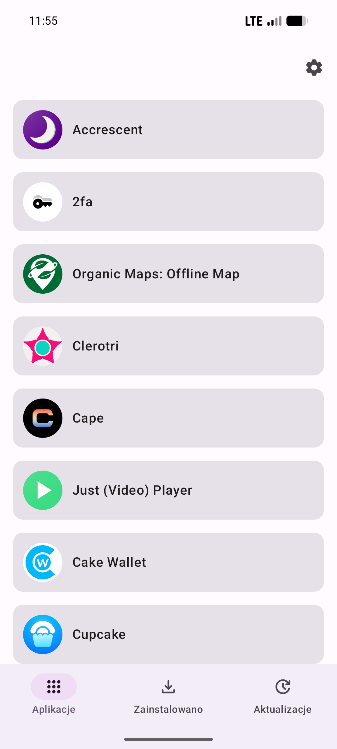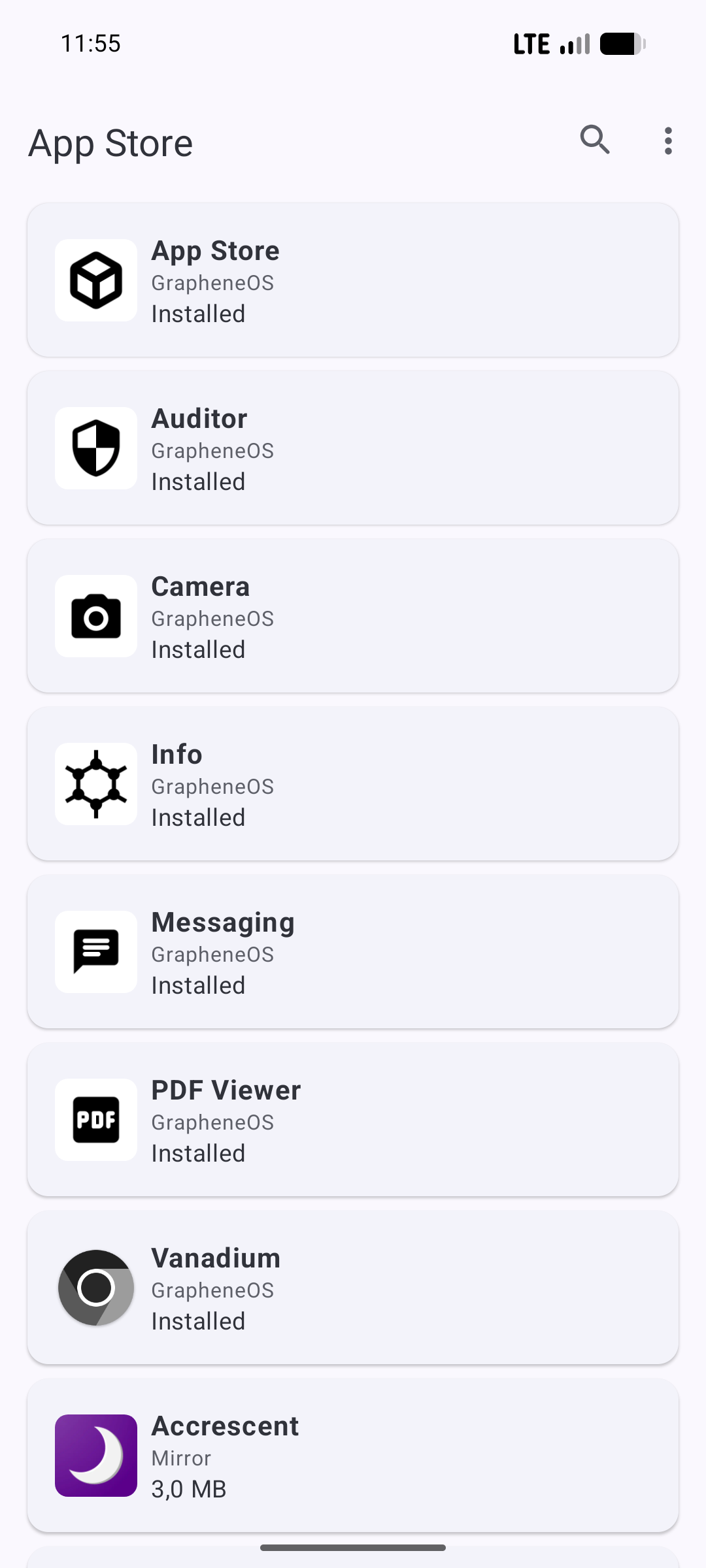 Żeby uzyskać dostęp do dodatkowych aplikacji, musimy z App Store zainstalować sklep Accrescent. Po zainstalowaniu zyskujemy dostęp już do nieco większej ilości przydatnych aplikacji jak np. Molly (fork Signala), IronFox (fork Firefoxa) czy Organic Maps. Jako że Accrescent jest dopiero w powijakach stąd ilość dostępnych aplikacji nie powala, na moment pisania artykułu jest ich 32 (aktualizacja: na dzień 18.12.2025 aplikacji jest 37), możemy jednak liczyć na sukcesywne zapełnianie się sklepu. Potraktujmy go póki co jako źródło uzupełnienia naszego GrapheneOS w pakiet podstawowych aplikacji których domyślnie brak w systemie jak np. odtwarzacze, notatki, mapy itp. Znakomita większość użytkowników jednak i tak zainstaluje sobie F-droida.