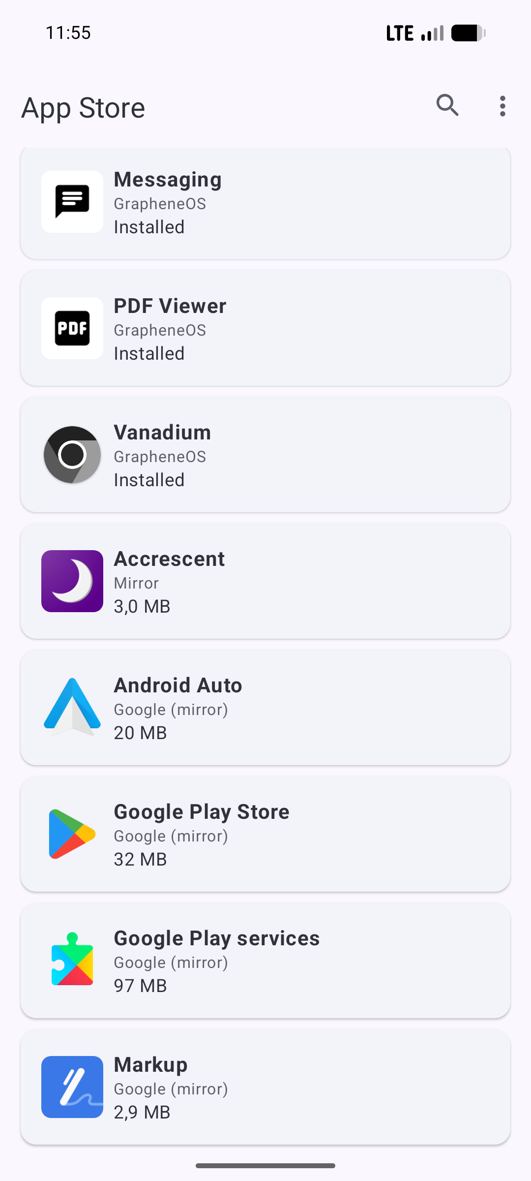 GrapheneOS posiada swój własny sklep z aplikacjami. Co prawda nie znajdziemy w nim za wiele programów (na tą chwilę jest ich 12), jednak jego rola jest nieco inna niż znanych nam do tej pory sklepów z aplikacjami. App store służy głównie do aktualizacji systemowych aplikacji jak np. Wiadomości i Kamera. Przede wszystkim jednak tutaj możemy zainstalować odizolowane usługi Google czy Android Auto.