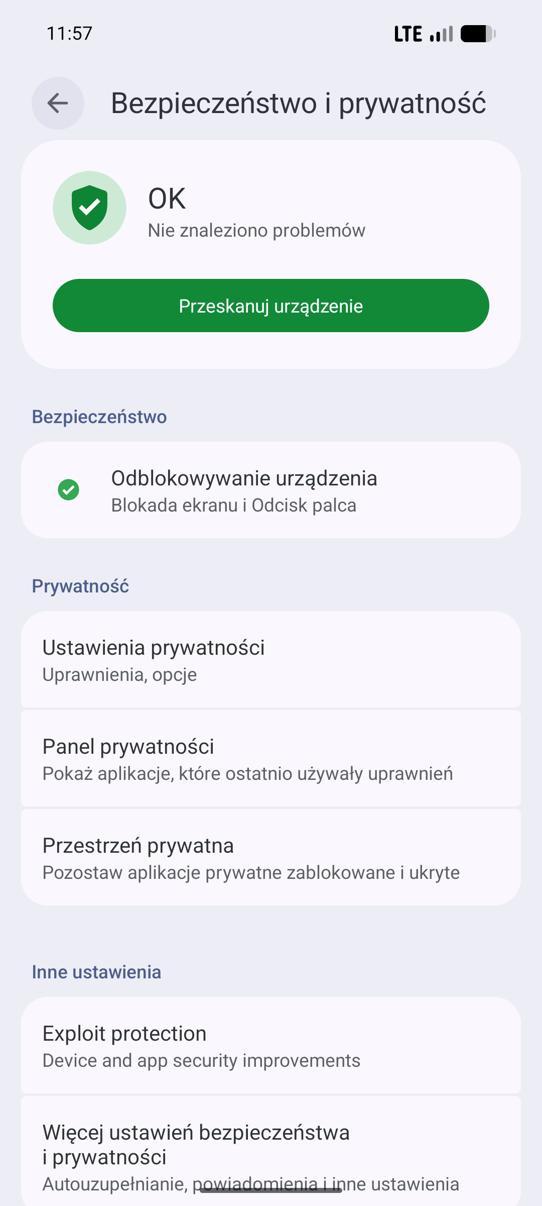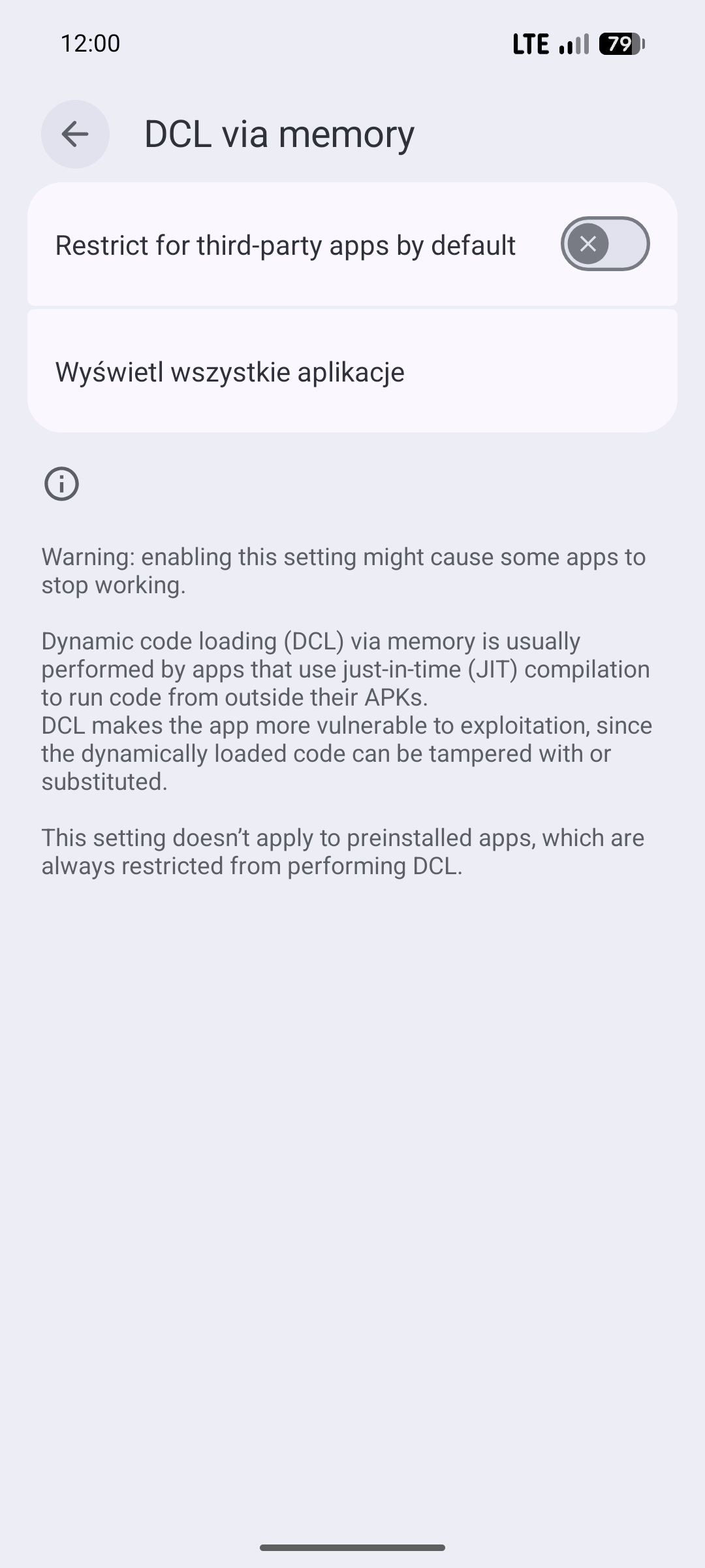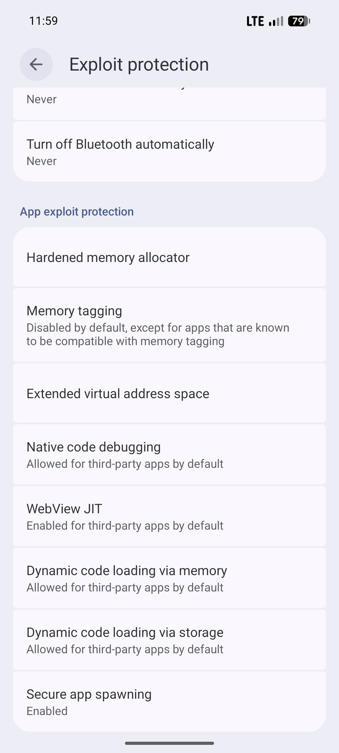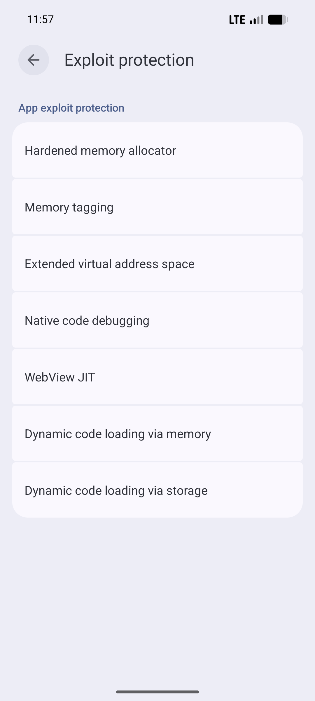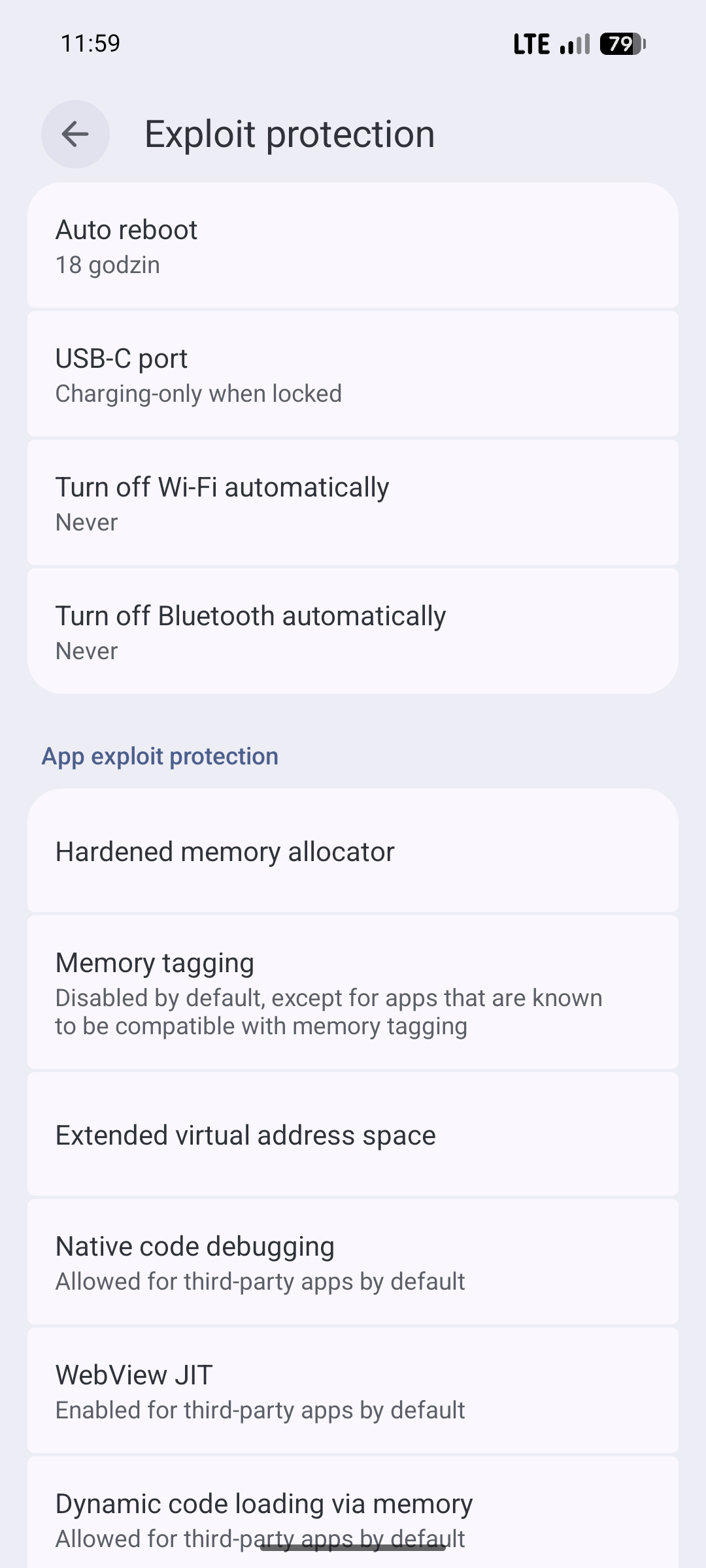 To co wyróżnia GrapheneOS to ich „znak firmowy” jakim jest ochrona przed exploitami. Po wejściu w menu Bezpieczeństwo i prywatność, podmenu Exploit protection znajdziemy przede wszystkim dostęp do przełączników odpowiedzialnych za ochronę przed zagrożeniami ze strony instalowanych aplikacji.