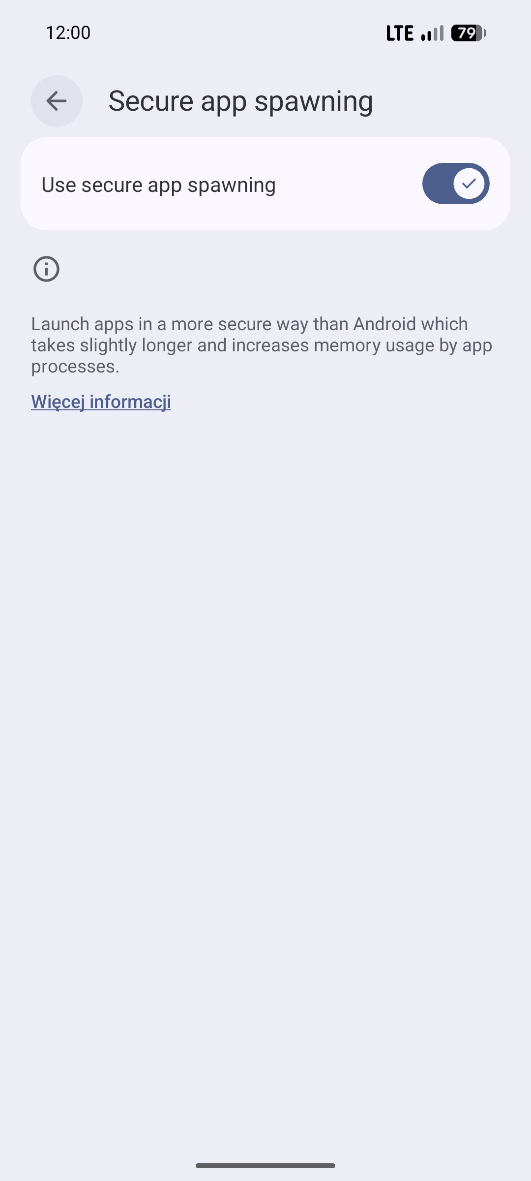 Funkcja Secure app spawning jest domyślnie włączone po instalacji systemu, więc początkowo możecie być rozczarowani wydajnością podobnie jak ja. Spodziewałem się, że po którejś aktualizacji systemu problem zniknie, okazało się, że jednak nie. Wychodzi na to, że obniżenie wydajności to cecha tejże funkcji. Na szczęście wystarczy tapnąć jeden przełącznik, żeby system wrócił do żywych. Tutaj niestety stoimy przed nie lada dylematem, ponieważ jest to jedna z flagowych funkcji GrapheneOS. W tym przypadku każdy sam musi odpowiedzieć sobie na pytanie na ile mój telefon ma być bezpieczny, a na ile wydajny. Jednak nie popadajmy w paranoję, jest to tylko jedna z wielu funkcji bezpieczeństwa dostępnych na naszym systemie.