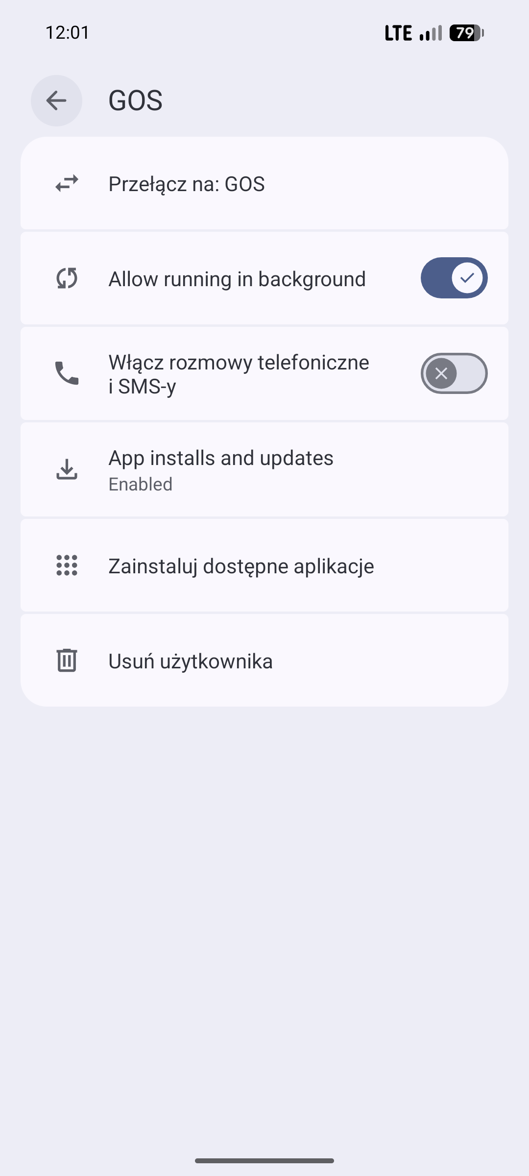 Kolejnym wyróżnikiem od GOS jest możliwość wyłączenia możliwości korzystania z funkcji telefonu jak połączenia czy smsy. Możemy także wyłączyć możliwość instalowania aplikacji czy skopiować zainstalowane aplikacje z głównego profilu. Oczywiście na każdym z profili możemy używać (lub nie) osobnego VPN.