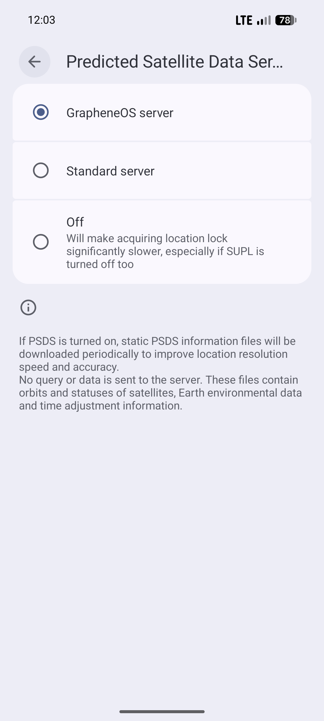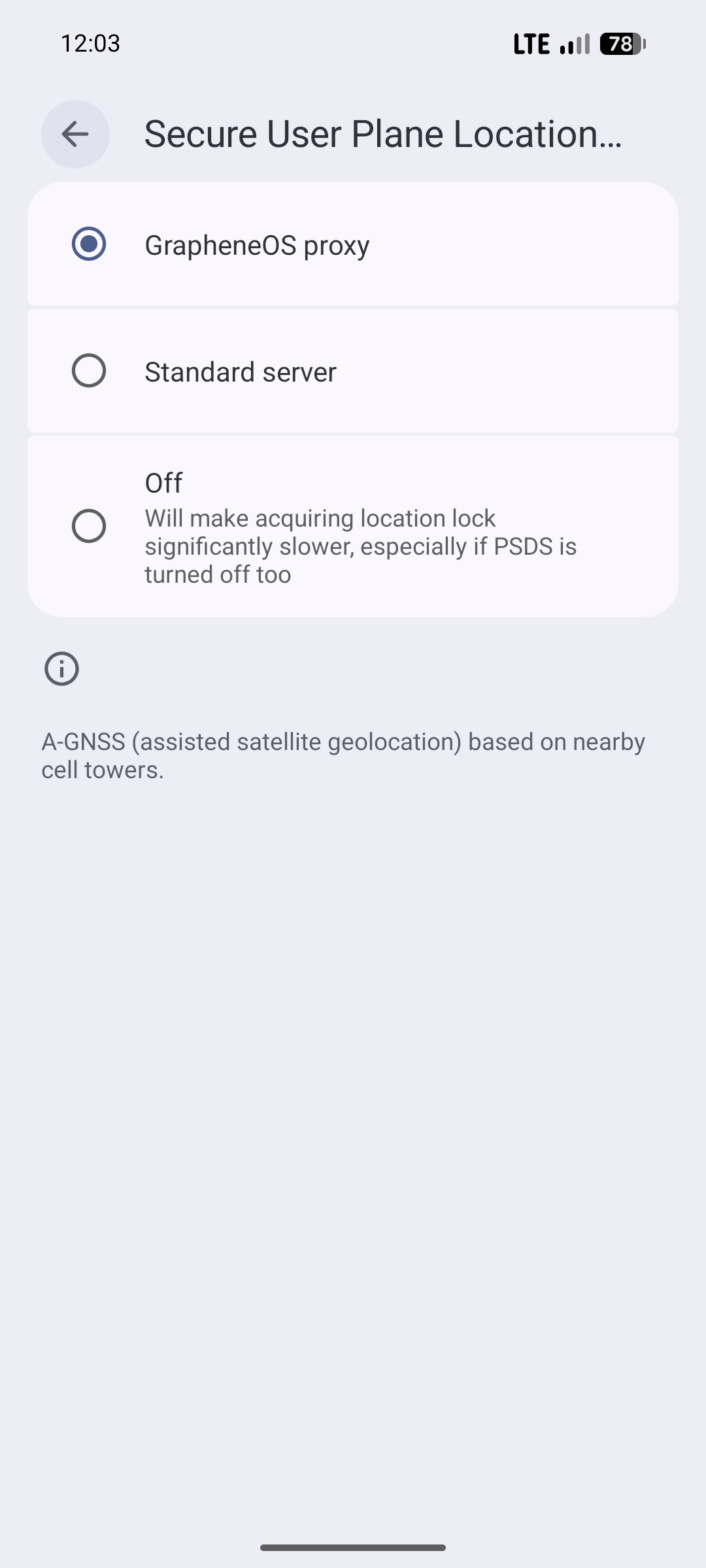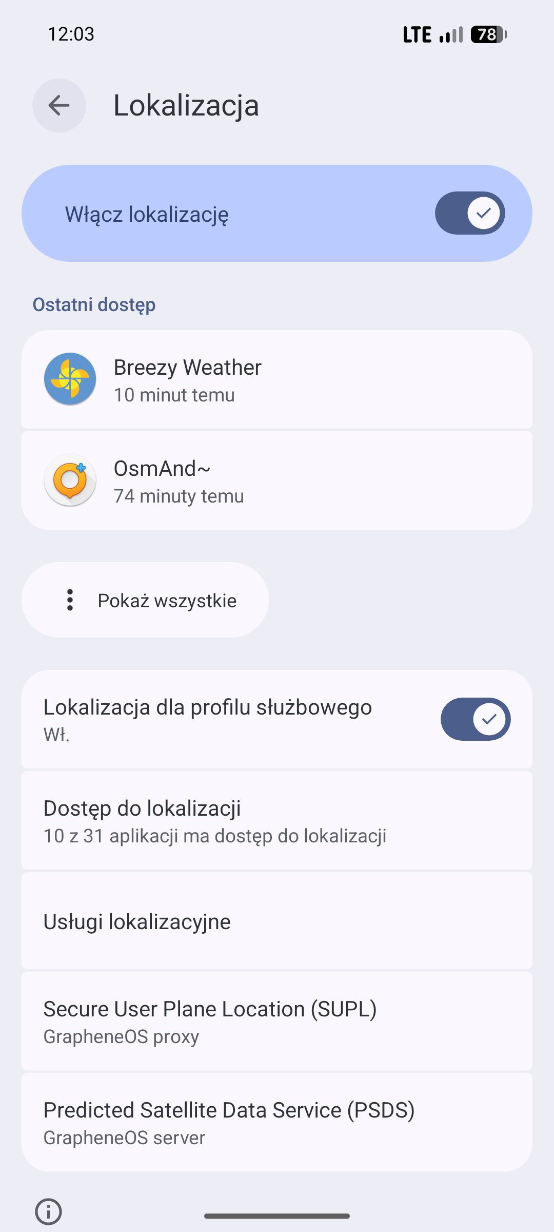 GrapheneOS zapewnia własną implementację lokalizacji sieciowej. Umożliwia ona korzystanie bezpośrednio z usług lokalizacyjnych Google, lub pośrednio poprzez serwery proxy od GrapheneOS (domyślnie). W ustawieniach lokalizacji mamy opcje geolokalizacji A-GNSS (SUPL – Secure User Plane Location), czyli lokalizację wspieraną poprzez nadajniki sieciowe (BTS). Kolejną opcją jest Usługa danych satelitarnych (PSDS – Secure User Plane Location). Polega ona na okresowym pobieraniu paczek danych satelitarnych wspierających uzyskiwanie lokalizacji.