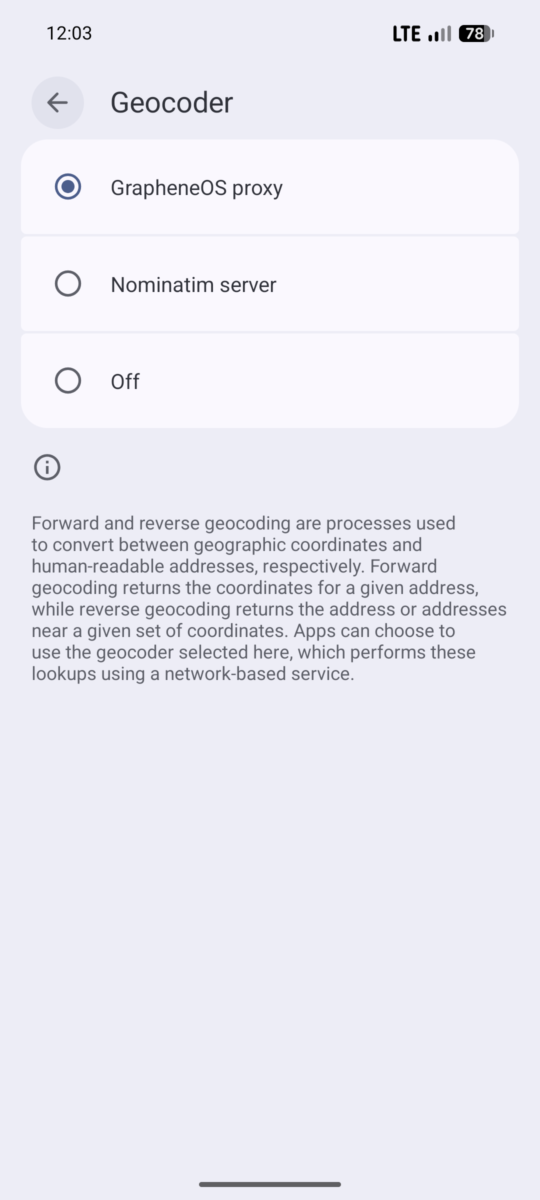 Tutaj poza standardowymi opcjami takimi jak Skanowanie Wi-Fi oraz Skanowanie Bluetooth mamy do wyboru dwie opcje specyficzne dla GrapheneOS. Pierwsza z nich to Network Location. możemy wybrać, czy w celu rozwiązania lokalizacji sieciowej GOS ma się łączyć bezpośrednio z serwerami Apple, czy za pośrednictwem własnych serwerów proxy. Kolejną opcją jest Geocoder, czyli usługa polegająca na obustronnym dekodowaniu adresów i współrzędnych geograficznych. W tym wypadku mamy wybór pomiędzy korzystaniem z serwerów proxy, lub z otwartoźródłowych serwerów Nominatim.