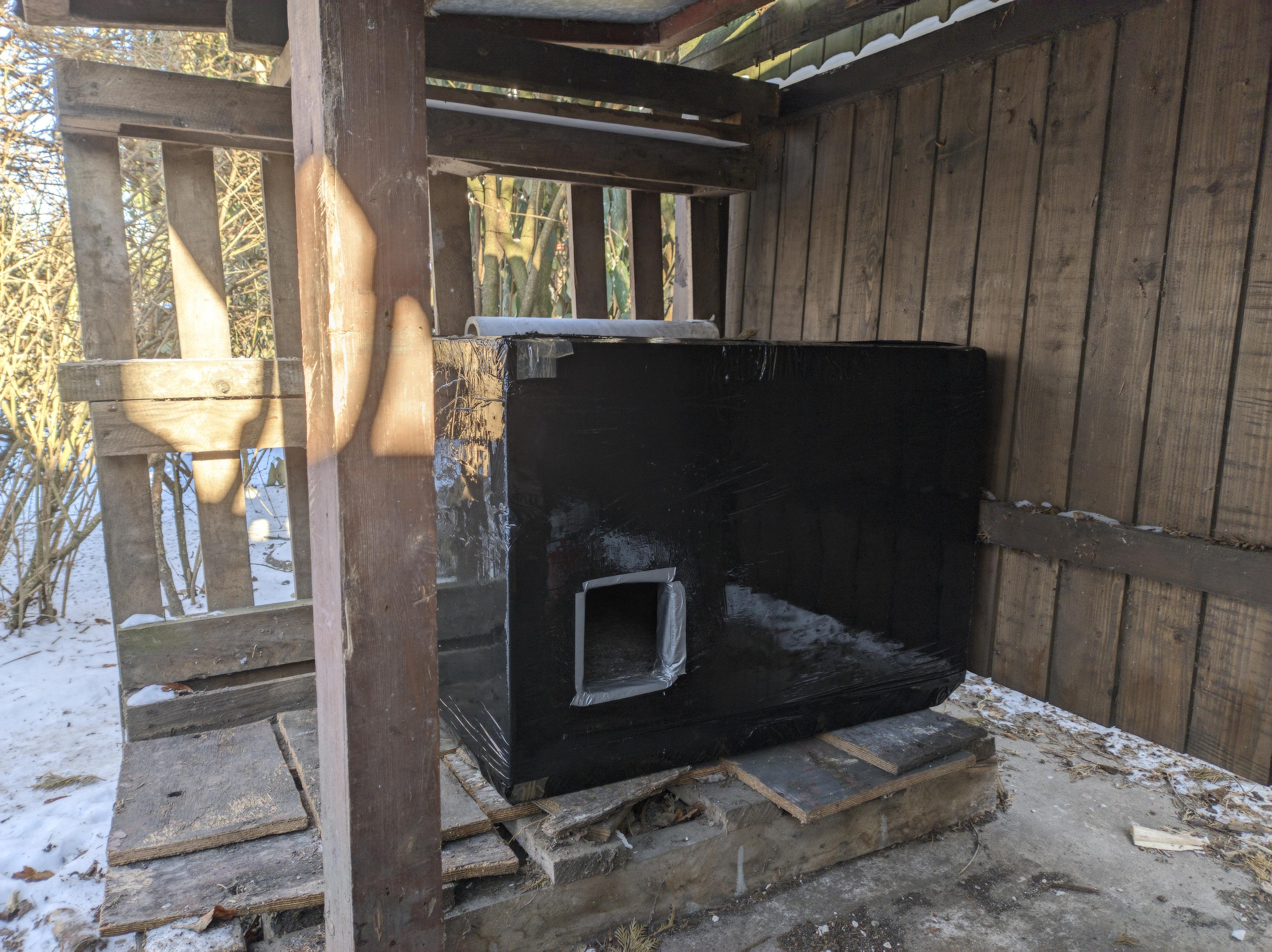 Budkę ustawiliśmy pod niedużym zadaszeniem, gdzie dostają żarcie. Na starych paletach, żeby dodatkowo odizolować od zimnego podłoża.